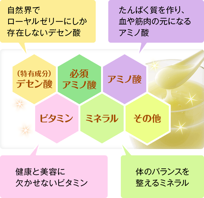 はちみつと混同する人も多いようですが、まったく異質のもので、はちみつはほとんどが糖質であるのに対し、ローヤルゼリーは40種類以上の栄養素を1度に取ることができます。また自然界ではローヤルゼリーにしか存在しないデセン酸も含まれています。