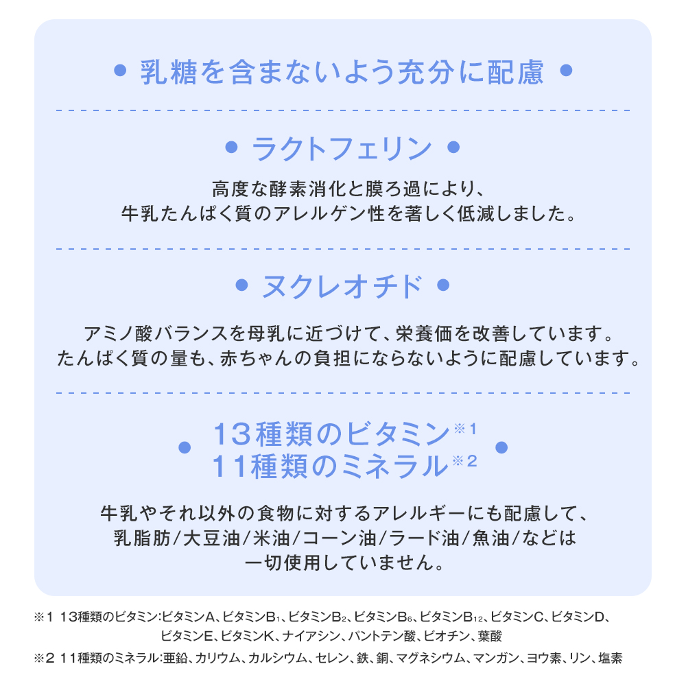 でんぷん分解物(国内製造)、調整脂肪(パーム核油、パーム油、大豆油、エゴマ油)、カゼイン(乳成分を含む)、ショ糖、酵母、L-カルニチン/リン酸水素二カリウム、炭酸カルシウム、レシチン、塩化カリウム、塩化マグネシウム、クエン酸、クエン酸三ナトリウム、炭酸カリウム、L-シスチン、ビタミンC、ラクトフェリン、イノシトール、硫酸第一鉄、タウリン、L-トリプトファン、硫酸亜鉛、ビタミンE、シチジル酸ナトリウム、パントテン酸カルシウム、ニコチン酸アミド、ウリジル酸ナトリウム、ビタミンB₂、5’-アデニル酸、硫酸銅、ビタミンA、イノシン酸ナトリウム、グアニル酸ナトリウム、ビタミンB₁、ビタミンB₆、葉酸、β-カロテン、ビオチン、ビタミンD₃、ビタミンB₁₂