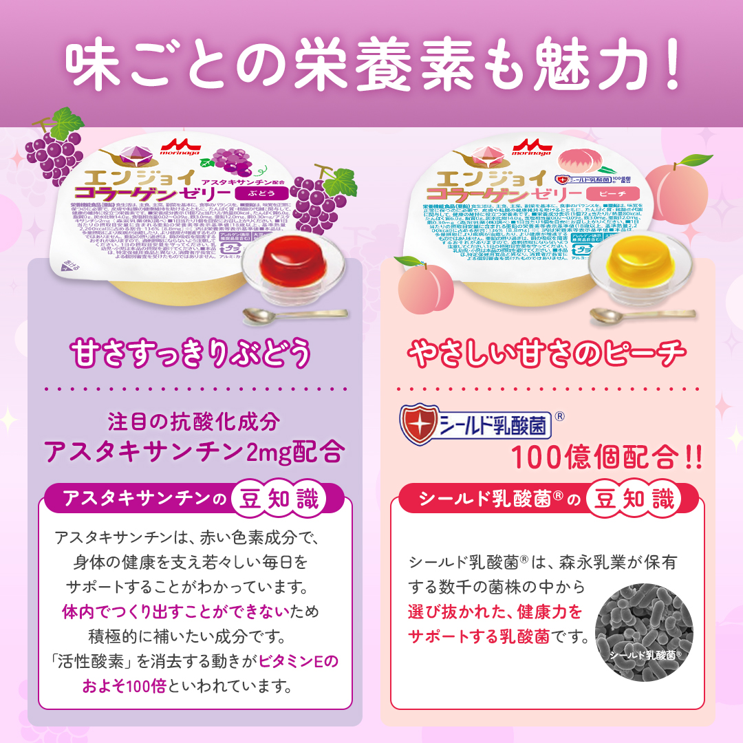 シールド乳酸菌®配合のピーチ、それぞれ果汁入りです。
