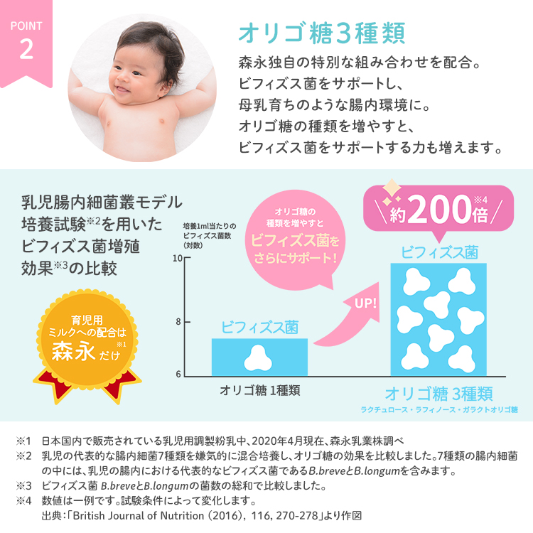「はぐくみ」と「E赤ちゃん」は、母乳に近づけるために配合している「3種類のオリゴ糖」、「ラクトフェリン」、「DHAとアラキドン酸」など、ほとんどの成分を共通としていますが、「牛乳たんぱく質の大きさ」に違いがあります。