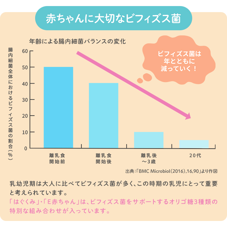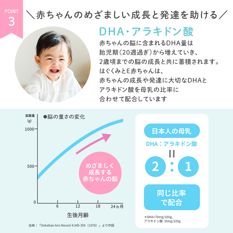 一般的な育児用ミルクの主な原料は牛乳のため、含まれるたんぱく質はウシ由来です。母乳に含まれるたんぱく質はヒト由来ですので、同じたんぱく質でも消化しやすさや性質が違います。牛乳たんぱく質を細かく分解した状態を"ペプチド"といいますが、「はぐくみ」は牛乳たんぱく質の一部を、「E赤ちゃん」は全ての牛乳たんぱく質を"ペプチド"にして、赤ちゃんの消化負担に配慮しています。消化機能が未熟な新生児期には「E赤ちゃん」をおすすめしますが、「はぐくみ」「E赤ちゃん」ともに厚生労働省ならびに消費者庁から許認可を得て製造販売しているミルクですのでどちらともどうぞ安心してお使いください。