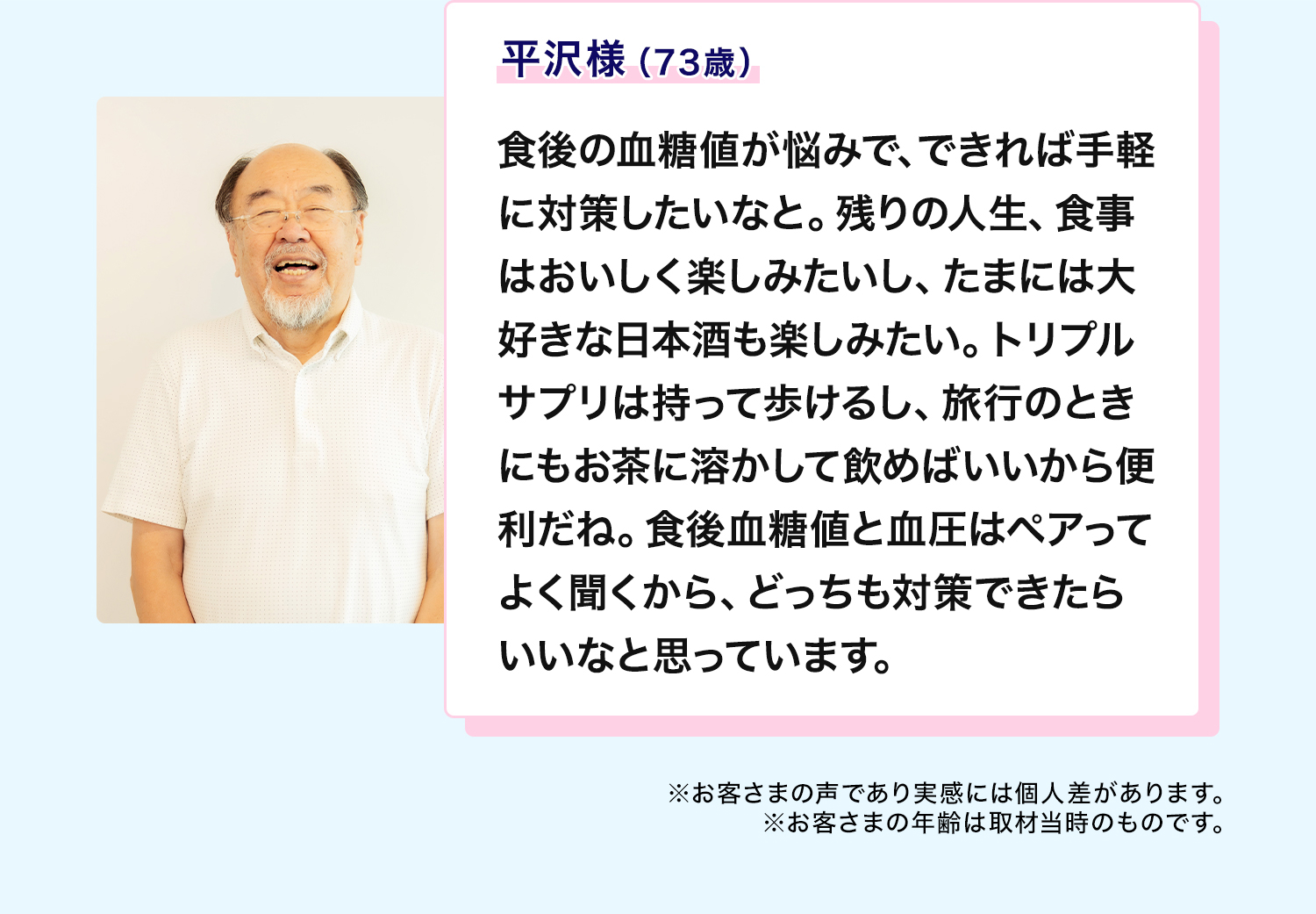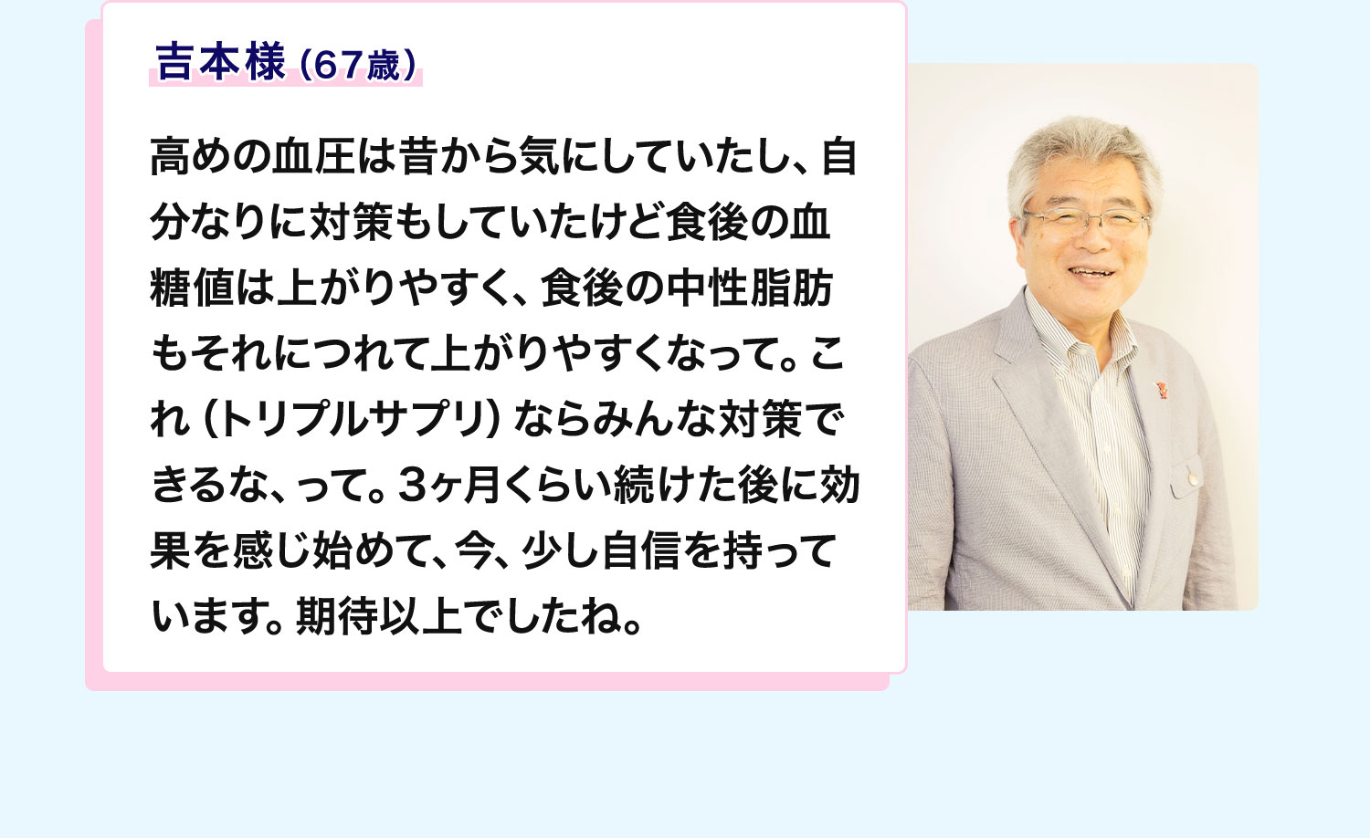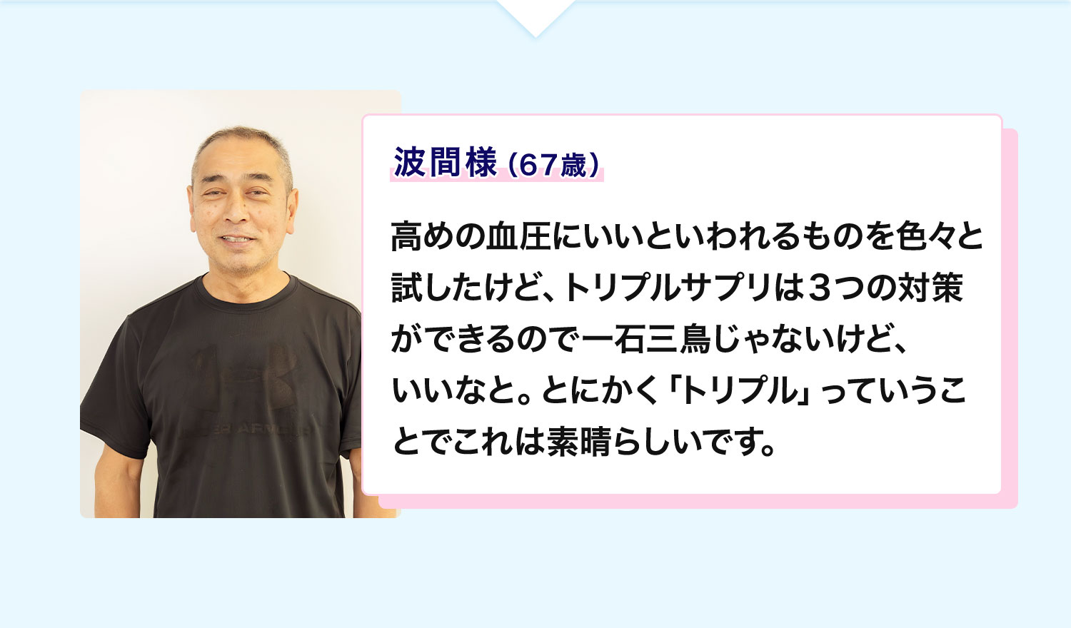 森永乳業がMKPを発見してから約20年、トリプルサプリが完成した時は、やっとお客さまにお届けできる!と嬉しく思いました。こだわったのは、飲み続けられるおいしさを維持すること。「クリープ」や「ミルク生活」など、粉末製品のおいしさを追求してきた森永乳業の知見を活かし、コーヒーなど他の飲料とも相性の良い深みのあるミルク味に仕上げました。血圧・血糖値・中性脂肪が気になる方にはもちろん、今気にならない方にも、お守りとしてもおすすめです。